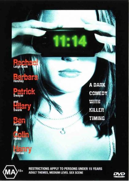 The movie 11:14 shows the adventures and mis-adventures of some of the residents of a small rural town one night. It shows, by various flashbacks and time-lines, where each character is at 11:14 pm and the incidents leading up to that fateful hour of the night. Racheal Leigh Cook (Cheri) is more involved then would first appear. Patrick Swayze (Frank), Henry Thomas (Jack), and Hilary Swank (Buzzy), are just a few of the many other characters involved in this dark, off-beat comedy. There are several intersecting story lines to hold your attention. Be advised there is graphic violence and an abundance of strong language.
